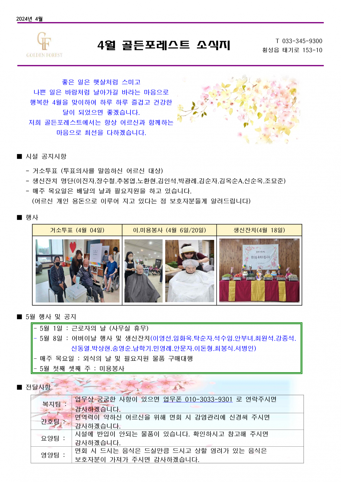 2024년 4월 골든포레스트 소식지 페이지 정보 작성자 관리자 댓글 댓글 0건 조회Hit 421회 작성일Date 24-04-23 11:11 본문 - 추천0 목록 이전글2024년 5월 골든포레스트 소식지 24.05.17 다음글2024년 3월 골든포레스트 소식지 24.03.01 댓글 0 댓글목록 등록된 댓글이 없습니다.